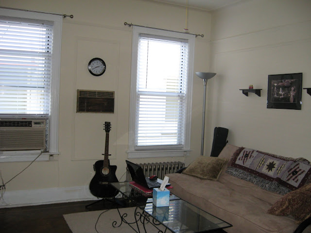Our pretty living room-featuring our AWESOME futon and Michael's guitar :)