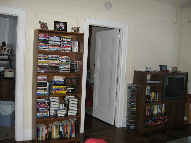 The other side of the living room-which leads to the kitchen and bedroom, and shows our entertainment center and bookcase full of our millions of movies :P (I won't bore you with pics of the bedroom and bathroom)