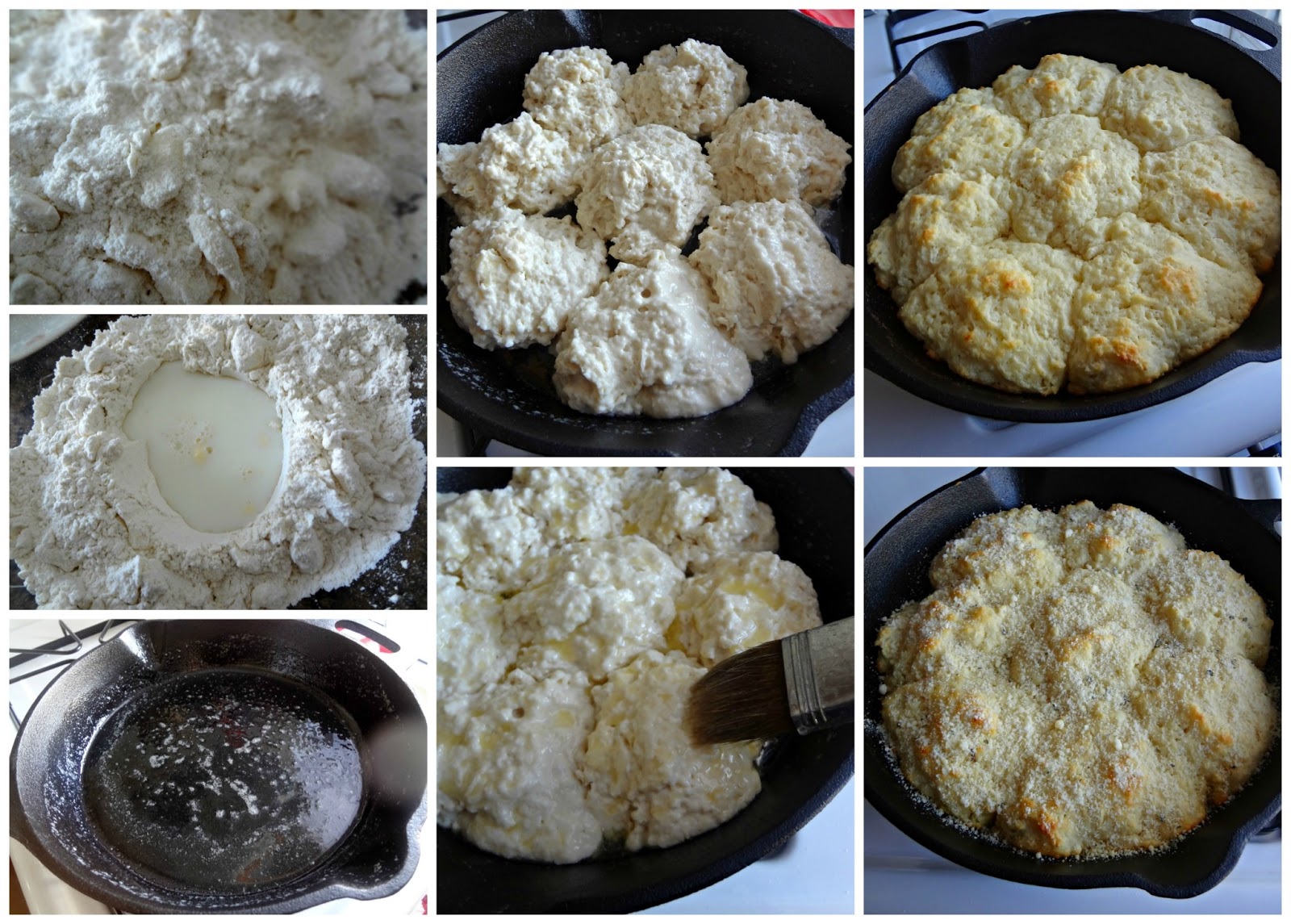 - Remove the hot skillet from the oven and add 1 tbsp. of butter. Once it is melted and has coated the skillet, drop the biscuit dough (1/4 cup at a time) into the skillet.