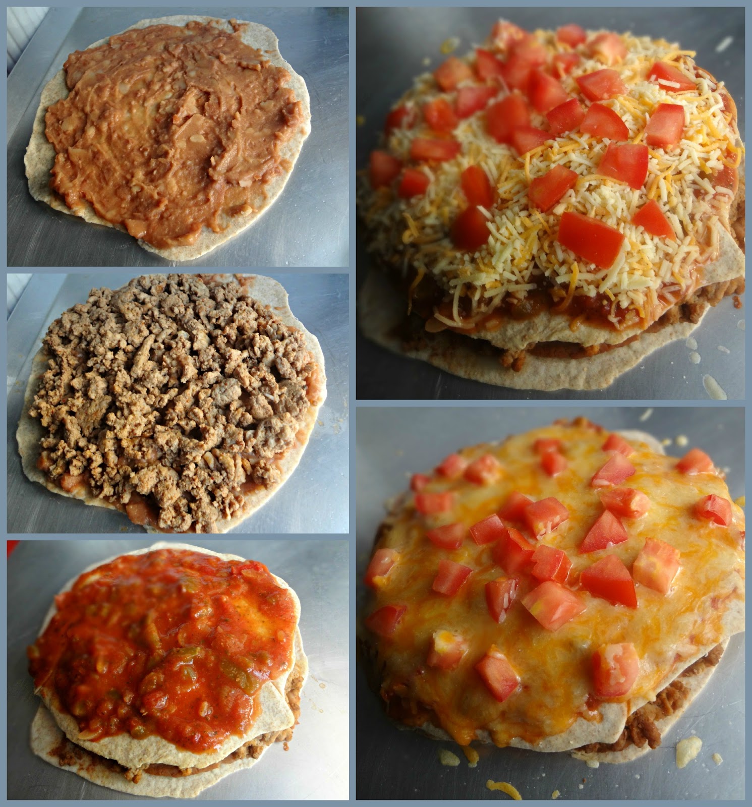 - Lay 1 tortilla on the prepared baking sheet. Spread refried beans, then cover with the taco meat.