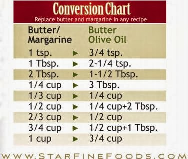Butter Flavored Olive Oil: And this one I mentioned on Monday. Butter flavored olive oil gives you the delicious flavor of butter with all the health benefits of olive oil-a small way to cut back on saturated fats, sodium, and cholesterol. I've tried olive oil in baked goods before and I couldn't get around the taste-I'm a butter girl, what can I say? So this is PERFECT for me-you can use the butter flavored olive oil in baked goods (duh), pasta, potatoes, popcorn, seafood, rice, corn, toast...etc etc. Just make sure to use this handy conversion chart: