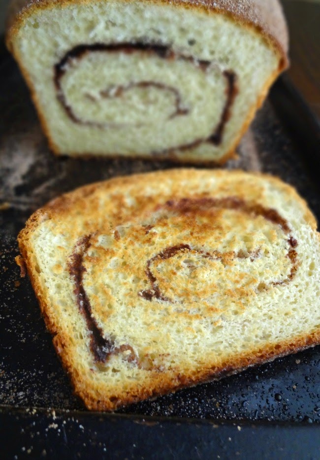 So. This bread. The top is a little crunchy because of the cinnamon sugar. The bread itself is soft and chewy (although, as stated, I like it best toasted. My bread was too big for my toaster so I just put it under the broiler until toasted--which is dangerous and a couple pieces may have been sacrificed to the burnt toast gods. Oops.) The cinnamon swirl is buttery and rich and super flavorful. I love it. You'll love it. Everyone's happy.