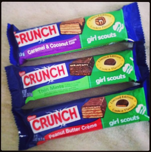 OMG you guys...have you tried these Girl Scout cookie flavored Nestle Crunch Bars yet??! They're my 3 fave girl scout cookies, (Peanut Butter Patties, Thin Mints, and Samoas) made into wafer/candy bars. And they are PHENOMENAL! Seriously...the flavors are spot on. I'm in love. (P.S. thanks mom for buying these for me from Rite Aid when we were out and about...love you! :P)